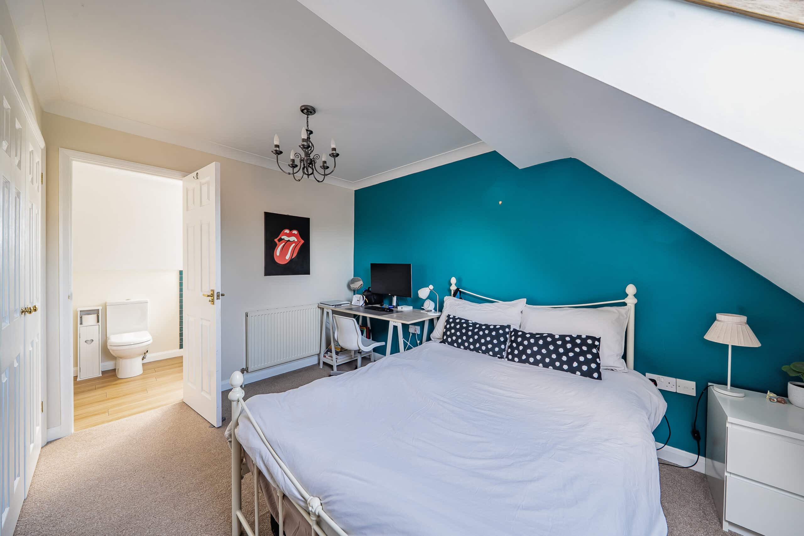 On the second floor, a small landing provides access to a useful storage cupboard. From here, a further double bedroom features a rear-facing Velux window and a built-in double wardrobe. The room benefits from an en-suite bathroom, fitted with a bath with shower attachment, WC and basin, along with a front-facing Velux window and an additional built-in storage cupboard, making it well suited as a guest suite or private upper-floor bedroom.