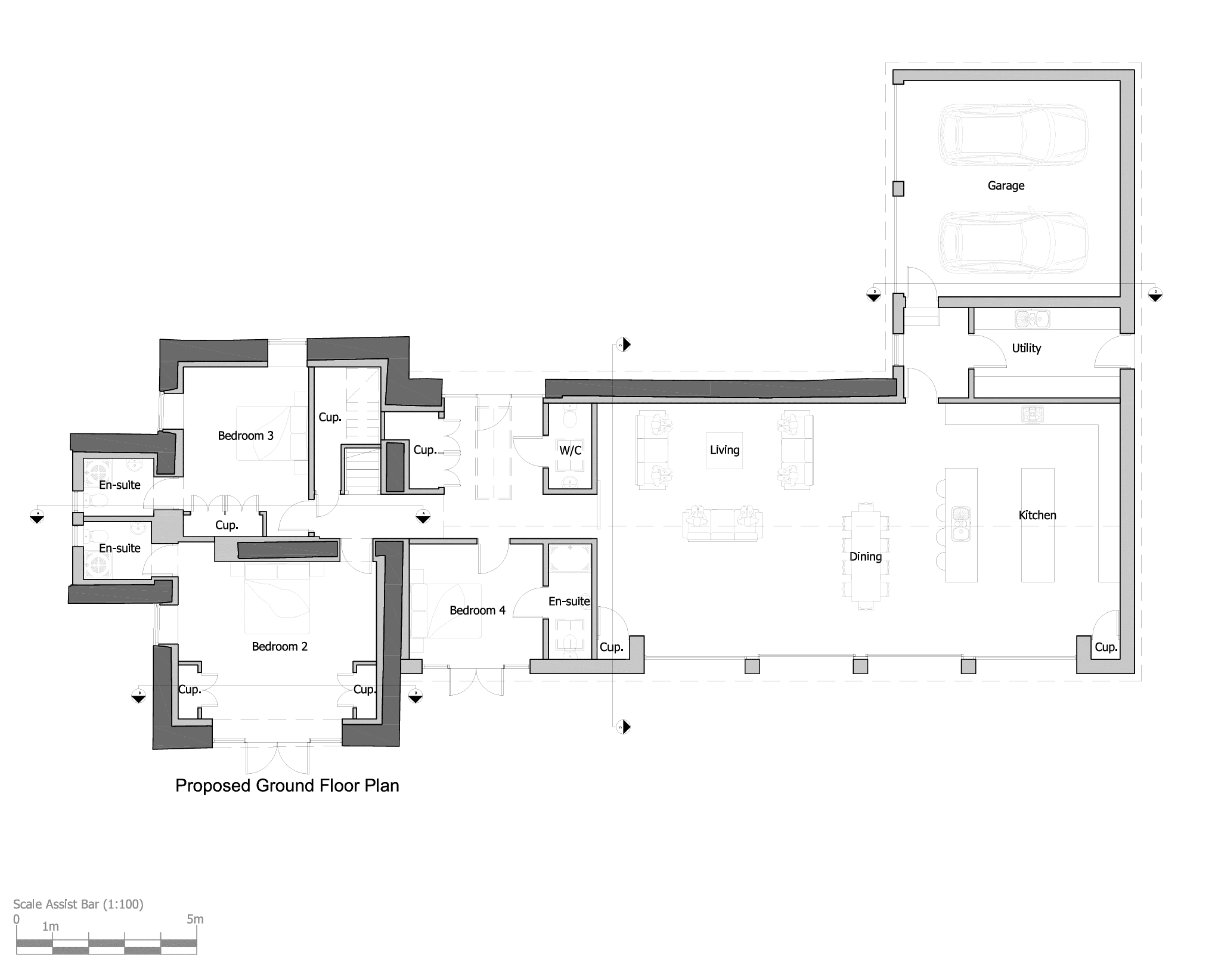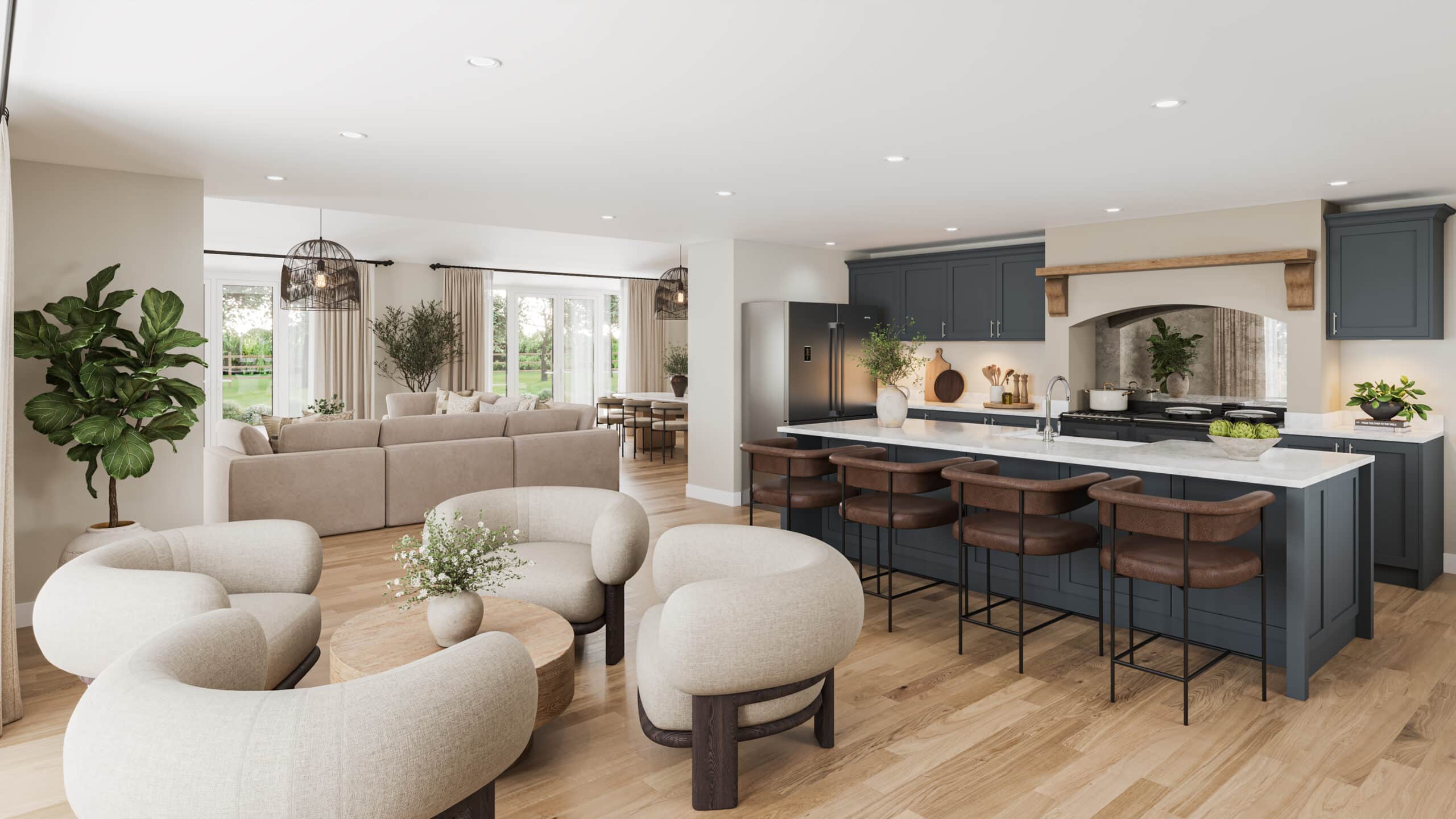 Entering the hallway, a downstairs cloakroom with WC and large double cupboard provides storage. The left wing of the home opens into a welcoming open-plan kitchen, dining and living space, featuring a vaulted ceiling and expansive glazing that floods the room with natural light while framing far-reaching countryside views and providing direct access to the garden. The contemporary kitchen will be fitted with high-quality appliances, a central island and additional breakfast bar, offering generous worktop and entertaining space. Internal doors lead to the utility room, which has an external door to the garden and access to the double garage.