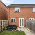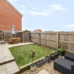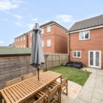 The rear garden is designed for easy upkeep and offers a paved patio directly from the kitchen and a pathway leading to a second patio beside a timber shed. A rear gate opens to a private courtyard where two allocated parking spaces are provided.
