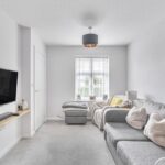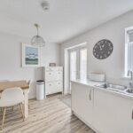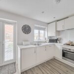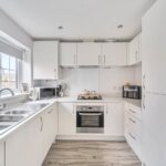 A storm porch shelters the front entrance, opening into a cloakroom area with space for coats and shoes and a generous downstairs WC fitted with wall-mounted basin and WC. To the left, the living room is a bright and comfortable space with front-facing window with Venetian blinds, understairs storage cupboard with lighting, and stairs rising to the first floor. A half-glazed door opens into the kitchen/dining room which is a contemporary space, fitted with off-white textured matt wall and base units with under-counter lighting, 1½ bowl sink with swan neck tap, Zanussi single oven, 4-ring gas hob with extractor, integrated dishwasher, fridge/freezer and washing machine. The dining area offers space for a table in front of the French doors leading to the garden, with light grey oak-effect Karndean flooring giving a cohesive finish.
