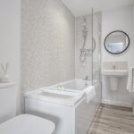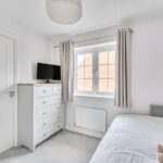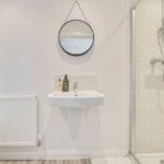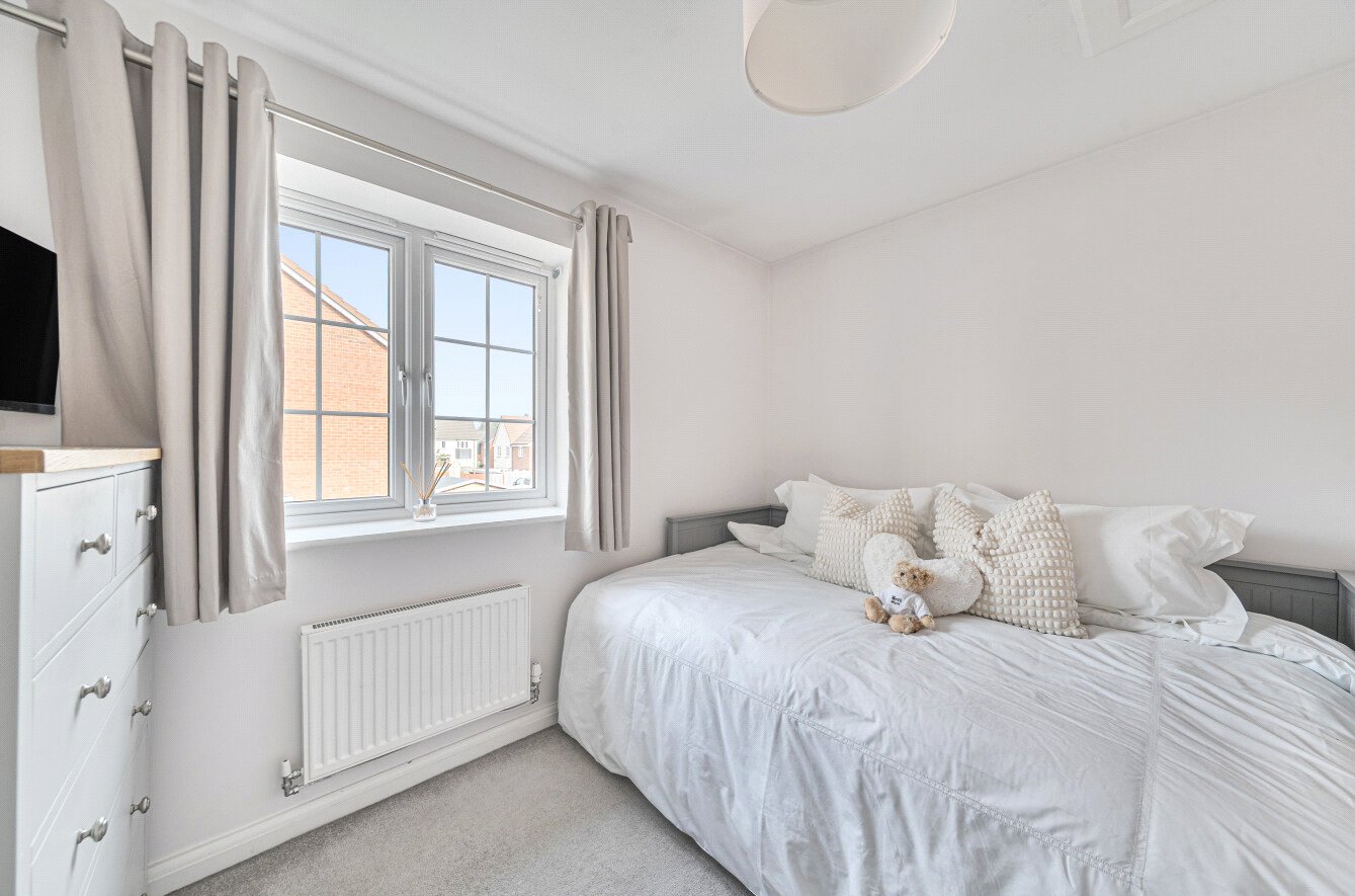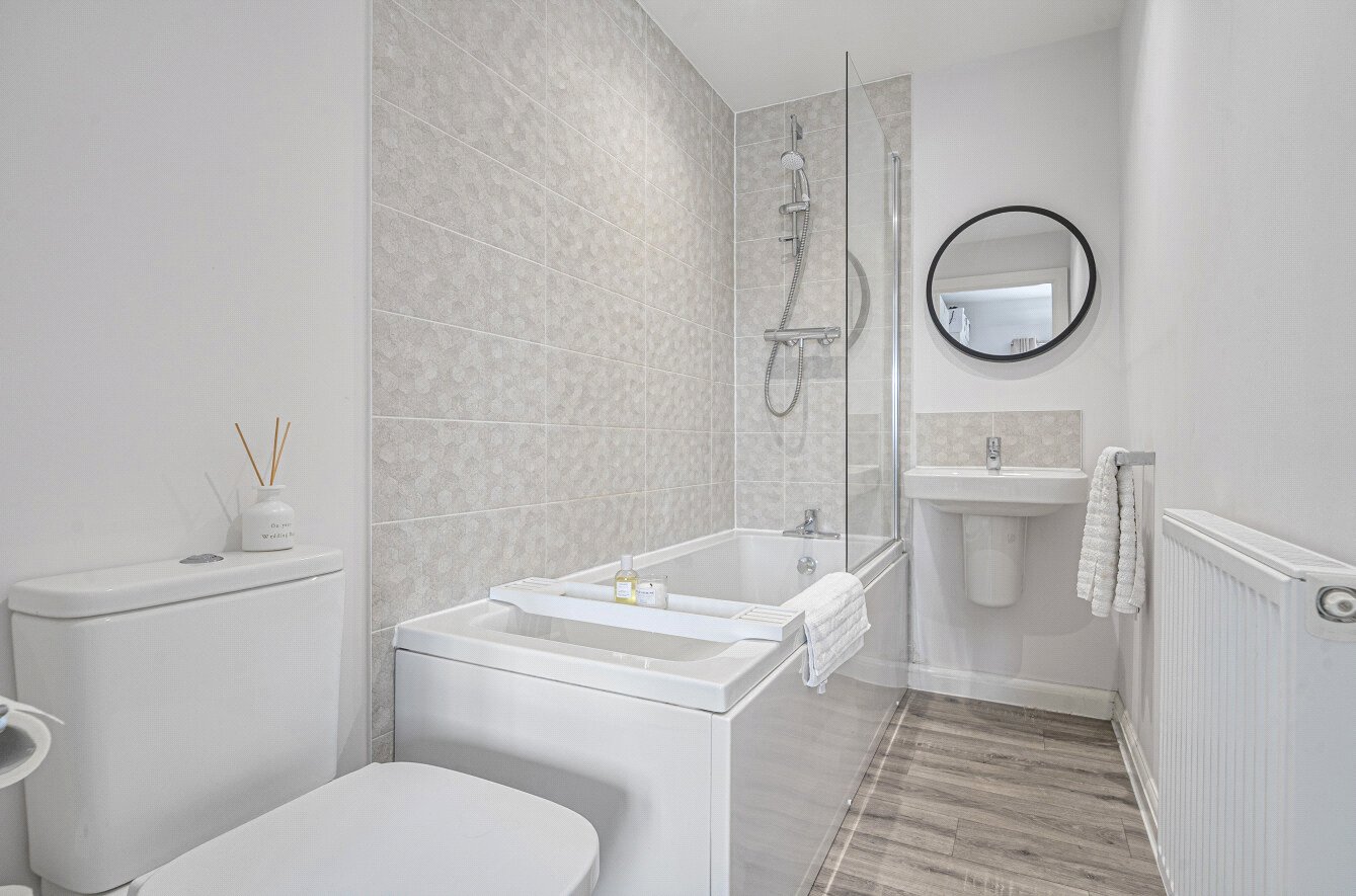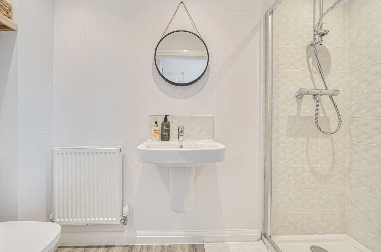 The principal bedroom is a generous double with front aspect window and private en-suite bathroom fitted with bath and Mira React shower over, shower screen, WC, wall-mounted basin and contemporary hexagonal patterned tiling. Bedroom Two is another double room with loft access and an en-suite shower room featuring Mira React shower, WC and basin. The landing provides access to a shelved linen cupboard over the stairs.
