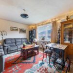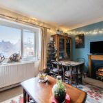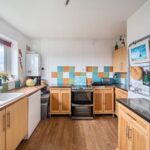 The kitchen enjoys far-reaching views and is fitted with wood-effect wall and base units, a freestanding washing machine, dishwasher, an electric double oven with induction hob and heated towel rail. A ceramic 1½ bowl sink with drainer is complemented by an instant boiling water tap, while a movable island with storage and a stainless-steel worktop adds flexibility and functionality to the space. The gas boiler, which is approximately four years old and serviced annually, is also located in the kitchen. The living room is a spacious and comfortable reception room with a front-facing window. A freestanding electric fireplace provides a focal point, creating a warm and welcoming atmosphere ideal for relaxation or entertaining.