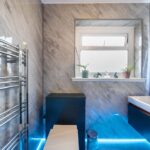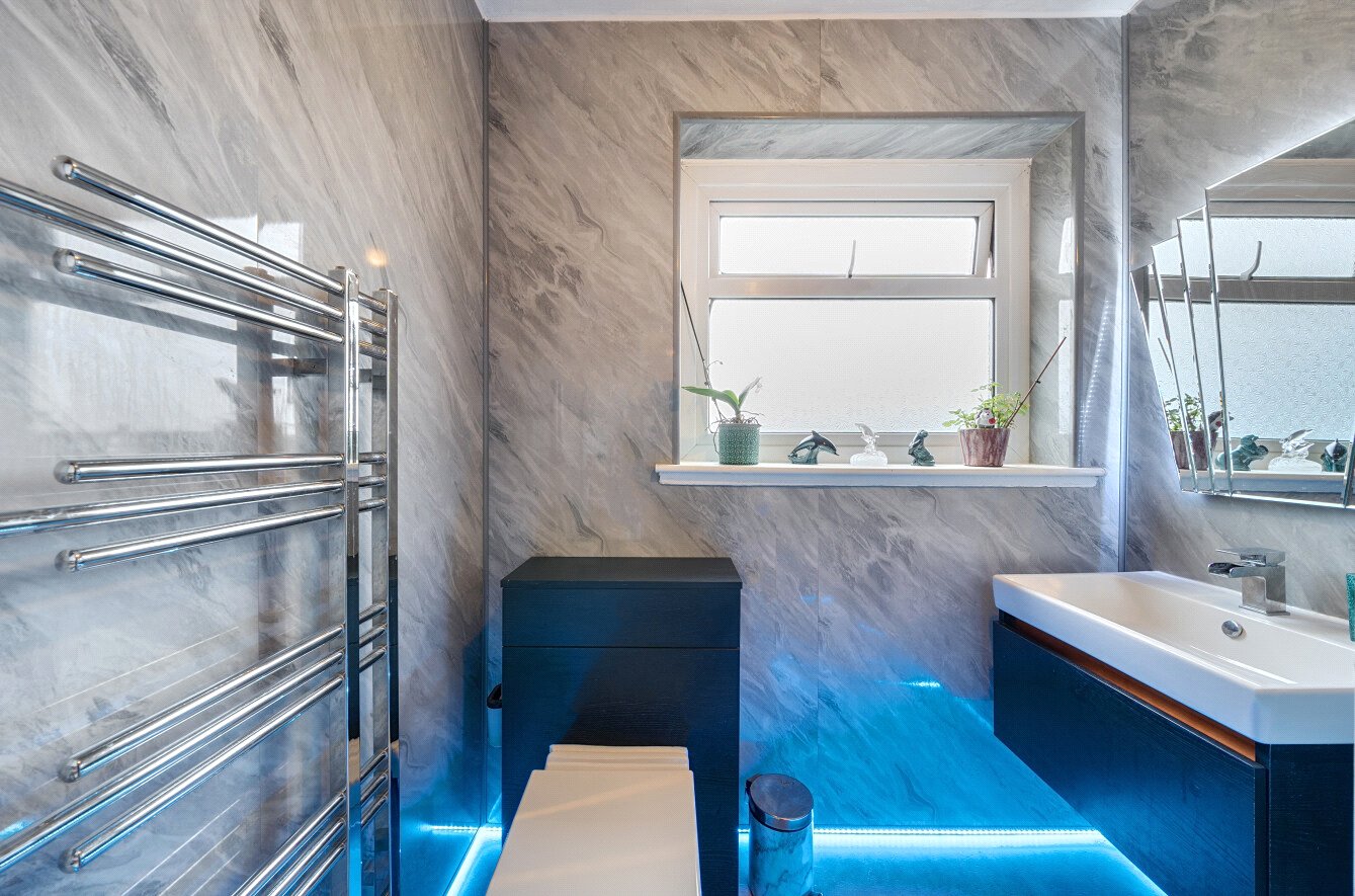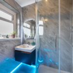 The recently updated shower room features a corner rainfall shower with a separate hand attachment, wall-mounted vanity unit with inset basin, and WC. Low-level LED lighting creates a contemporary feel, while grey marble-effect wall panels and a chrome heated towel rail complete the room.