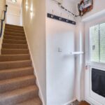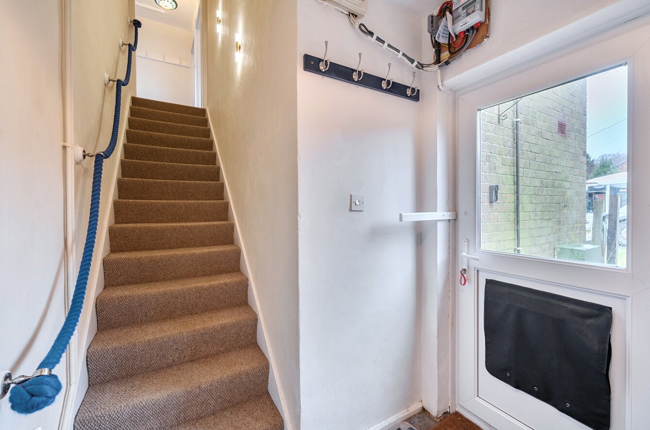The front door opens on the ground floor into a welcoming entrance area, where tiled flooring provides a practical and durable finish. A window to the front allows natural light to brighten the space, creating an inviting first impression. From the entrance, a door provides access to a useful boot room offering ample space for coats, shoes, and everyday storage, keeping the main living area clutter-free. Stairs rise from the entrance to the first floor, featuring a characterful rope handrail.