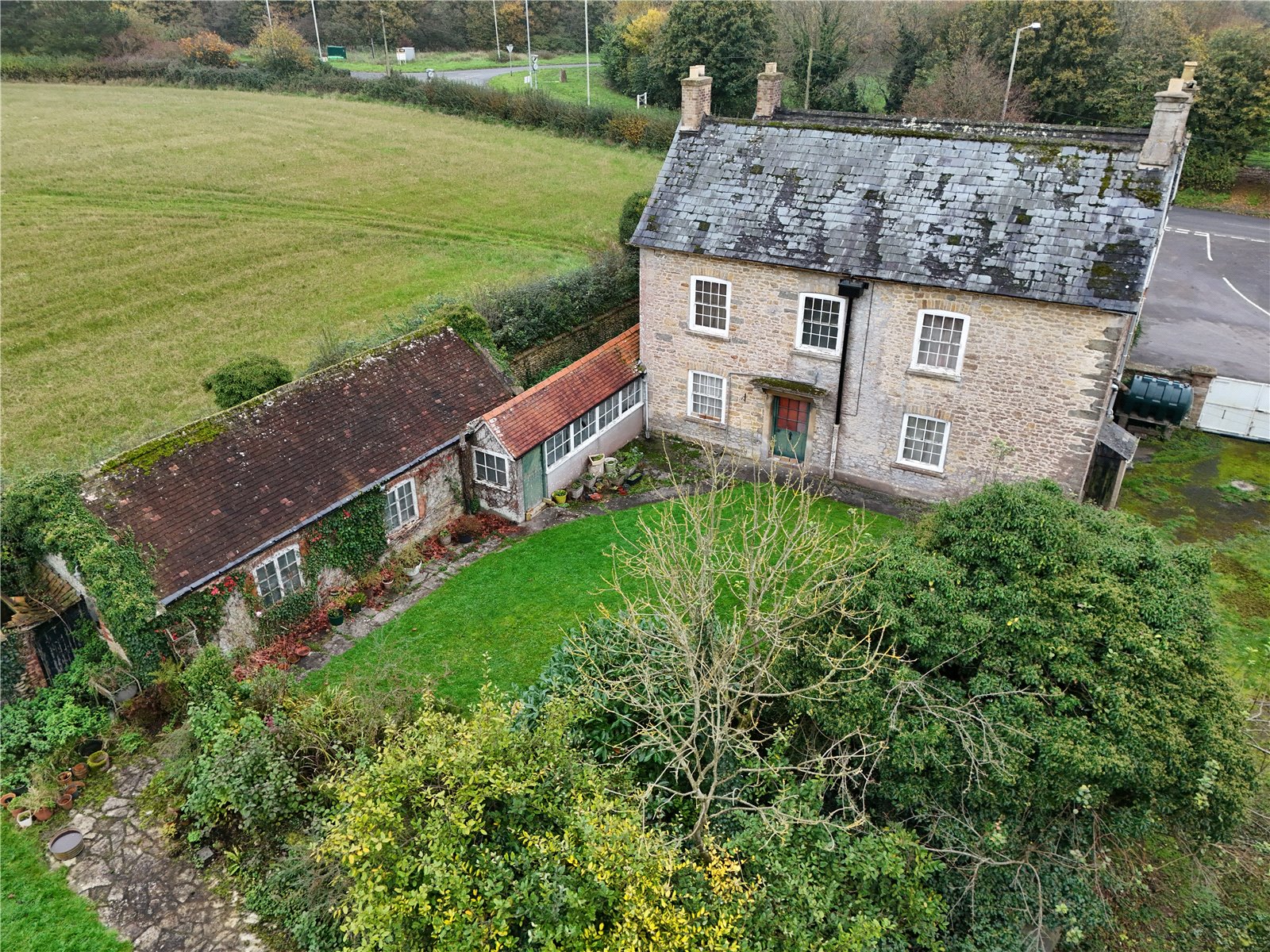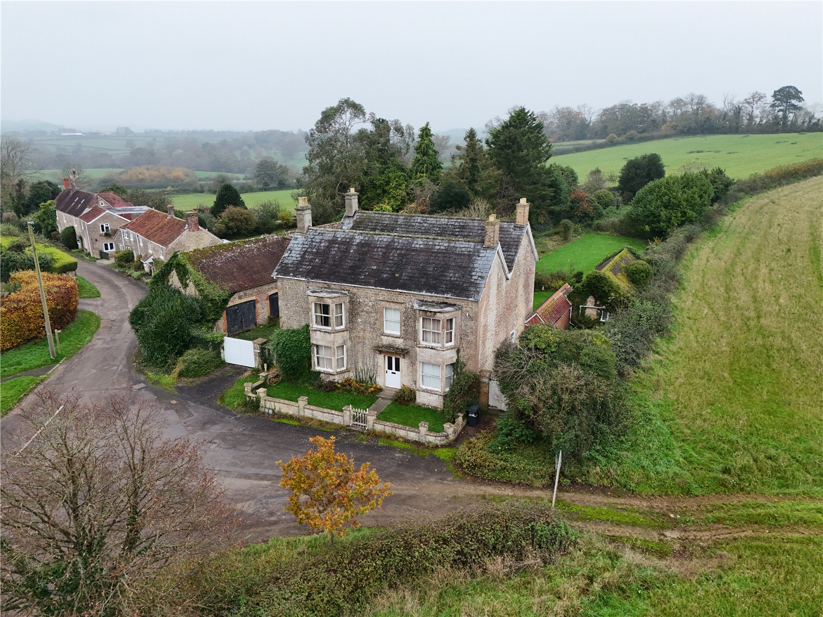 A handsome, double-fronted detached house, standing in 0.57 acres, in need of renovation throughout. The property boasts a detached former coach house, as well as an adjoining former dairy, both perfect for conversion to