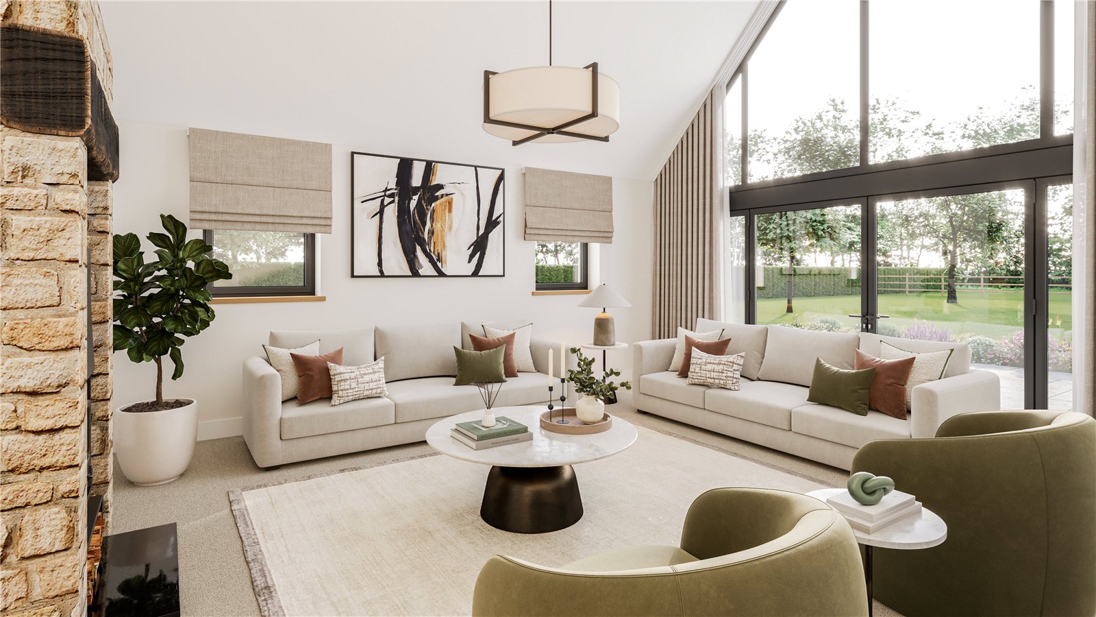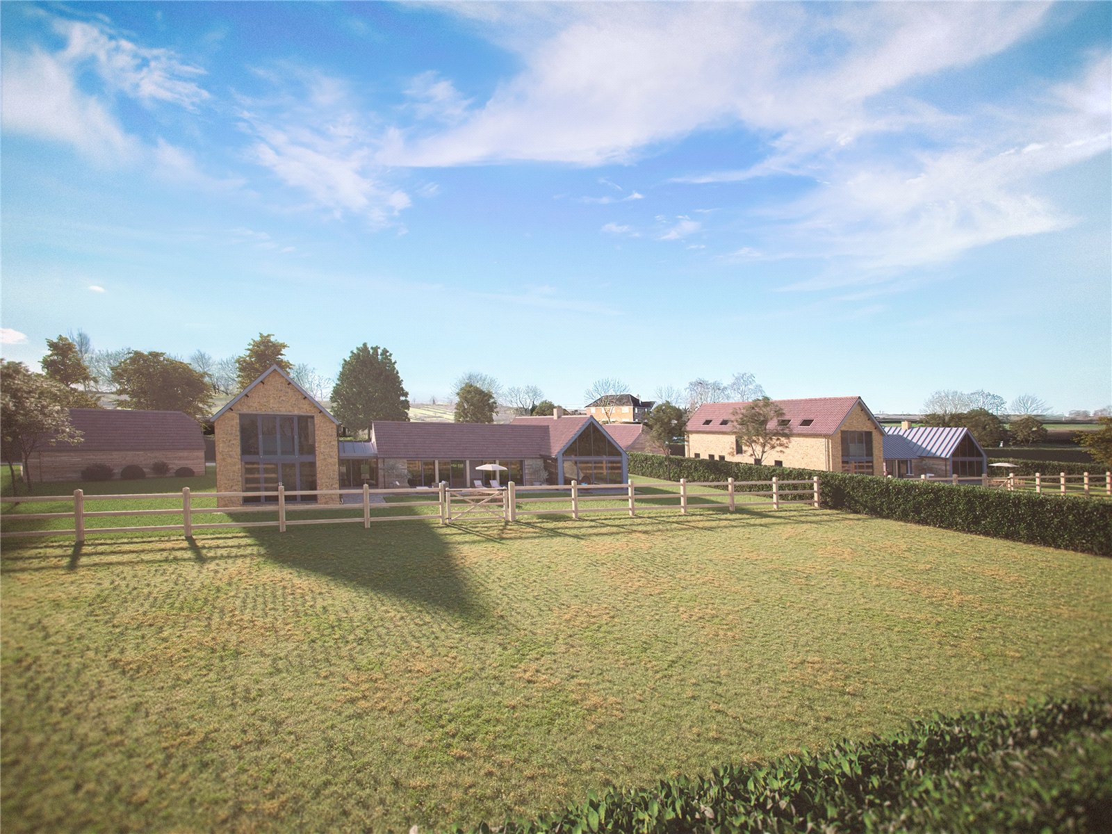 The rear garden will be laid mainly to lawn, with mature boundary trees offering natural screening and a sense of enclosure. A generous paved terrace will open directly from the open-plan living space, creating the ideal setting for outdoor entertaining and dining. Buyers will also have the option to personalise landscaping to their taste, including space for raised beds, a kitchen garden, or wildflower borders.