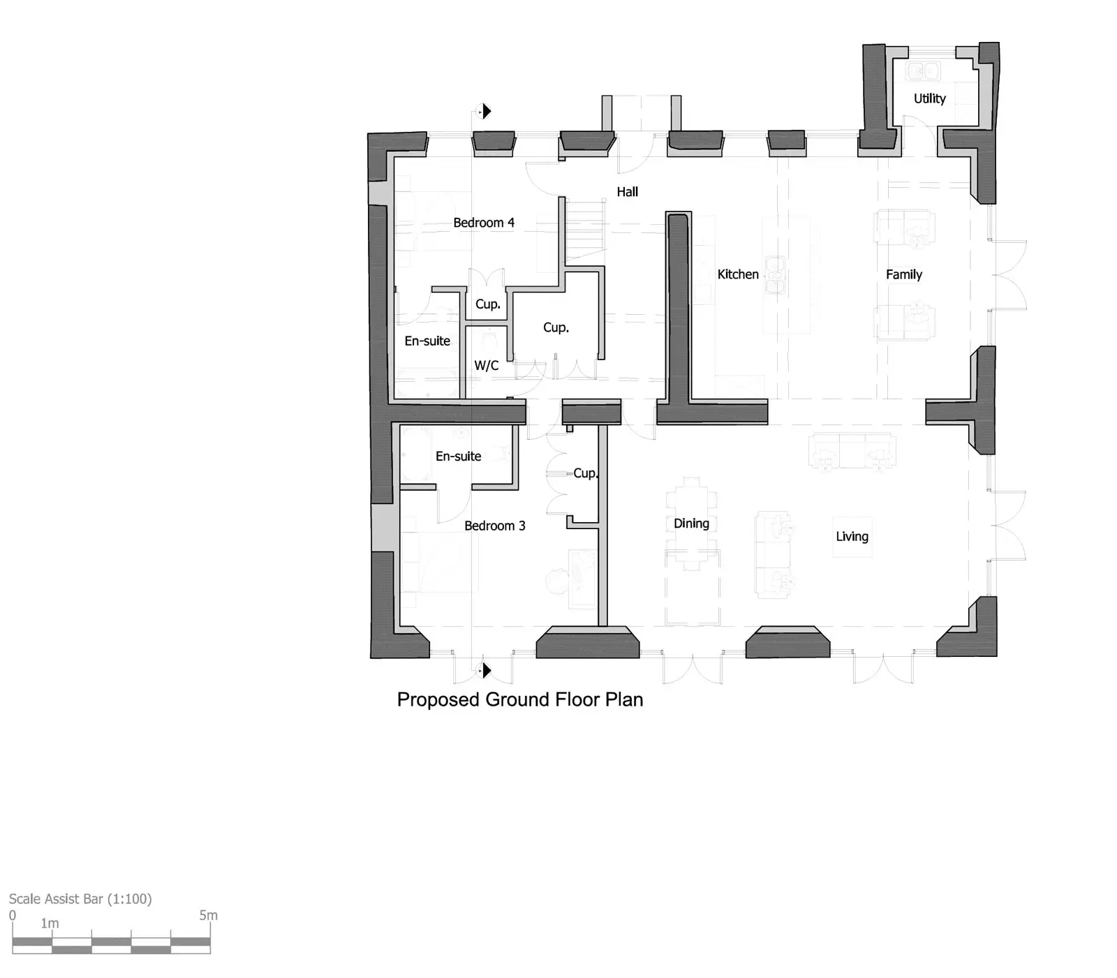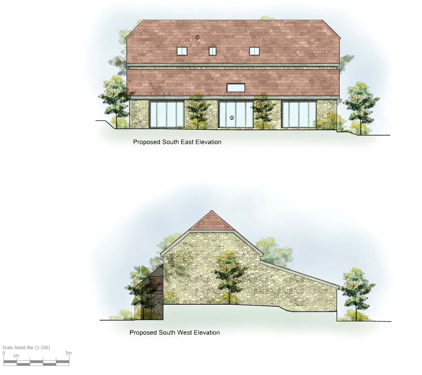 Entering into the hall, the adjoining kitchen opens out into a wonderful open plan living space with separate utility room. A kitchen island with inset sink looks across to the family seating area with French doors to enjoy the garden and the beautiful rolling hills beyond. The living space extends through to the living/dining room with three further sets of French doors which open to gardens at the South and East of the property providing ample opportunity to enjoy the sunlight throughout the day. Two spacious double bedrooms are on the ground floor, both with en-suite shower rooms and built-in wardrobes. A WC is conveniently located in the hallway next to a large understairs storage cupboard.