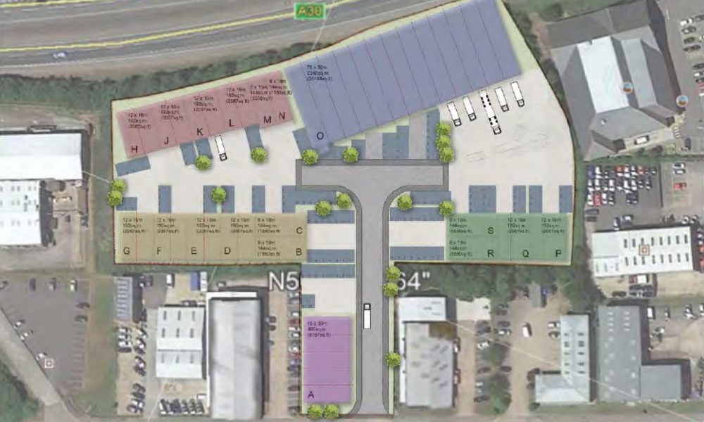 The site comprises 1.41 hectares (3.48 acres) with 140 m (c. 460 ft) to the A30. The existing access is via Devonshire Road. The proposed scheme will comprise 14 busi­ness / light industrial units of steel frame con­struction with insulated profile steel cladding to roof and part brick /block & part steel cladding to elevations.