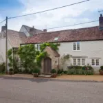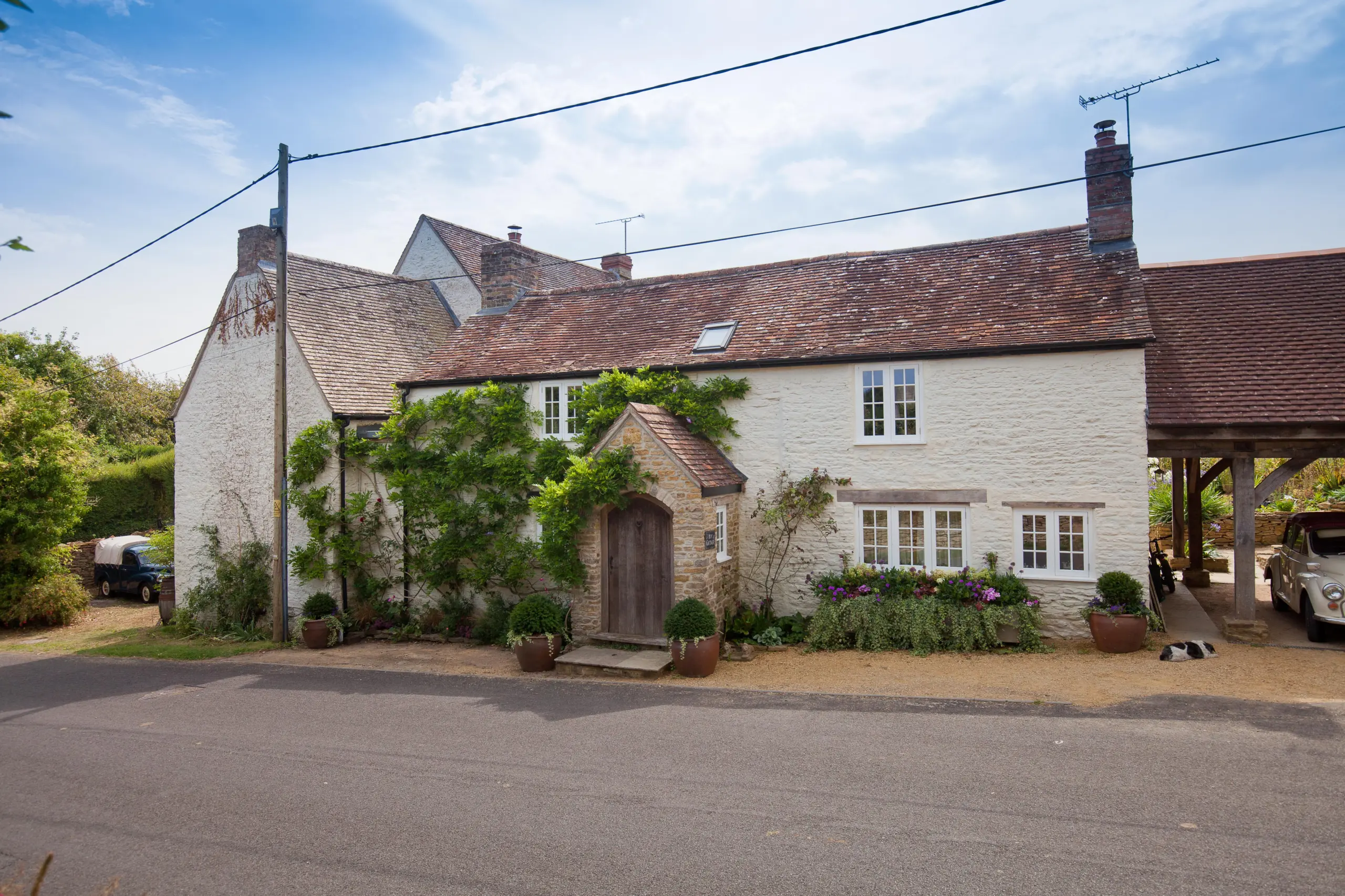 The front of the cottage is adjacent to Holton Street on the edge of the village, where a single carport provides sheltered parking. In addition, a gravelled parking area lies on the opposite side of the home, offering space for several vehicles and convenient access to the basement. To the rear, the gardens unfold into a series of beautifully arranged outdoor spaces. A stone-paved terrace sits just beyond the kitchen, perfect for al fresco dining, and is framed by planted borders. Beyond, wide lawns flow into areas of meadow and apple orchards, complemented by raised vegetable beds for home growing. Secluded seating spots are carefully tucked away, offering peaceful places to enjoy the gardens, while mature trees and hedging frame the border and create privacy.