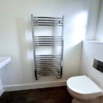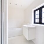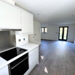 On entering the property, a downstairs cloakroom with WC is conveniently located to the right of the hallway with an understairs cupboard at the far end and stairs leading to the first floor. A door to the right opens into the open plan ‘L-shaped’ kitchen/living room which is a bright and inviting space with wood effect laminate flooring and French doors out to the garden. The kitchen, with ‘new grey’ oak effect laminate flooring, is fully fitted with base and wall units, laminate worksurfaces and integrated Neff appliances which include a fridge/freezer, dishwasher, oven, hob and extractor fan. The property enjoys underfloor heating throughout the ground floor and in the family bathroom.