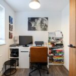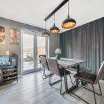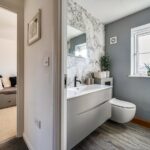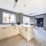 The front door opens into a spacious entrance hall finished with wood-effect laminate flooring and features a built-in cupboard providing practical storage for coats and shoes, with solid wood doors throughout the first floor, accentuating the modern feel. A cloakroom sits off the hallway and is fitted with a WC, vanity basin and heated towel rail. Also accessed from the hallway is a study, ideal for home working, with wood-effect laminate flooring and a front-facing window. The living room, with bay window, is positioned at the front of the property with a door through to the dining room, grey wood-effect laminate flooring underfoot and central pendant lighting. Rear-facing glazed patio doors open onto the garden, while a wood-panelled feature wall creates a focal point.