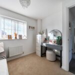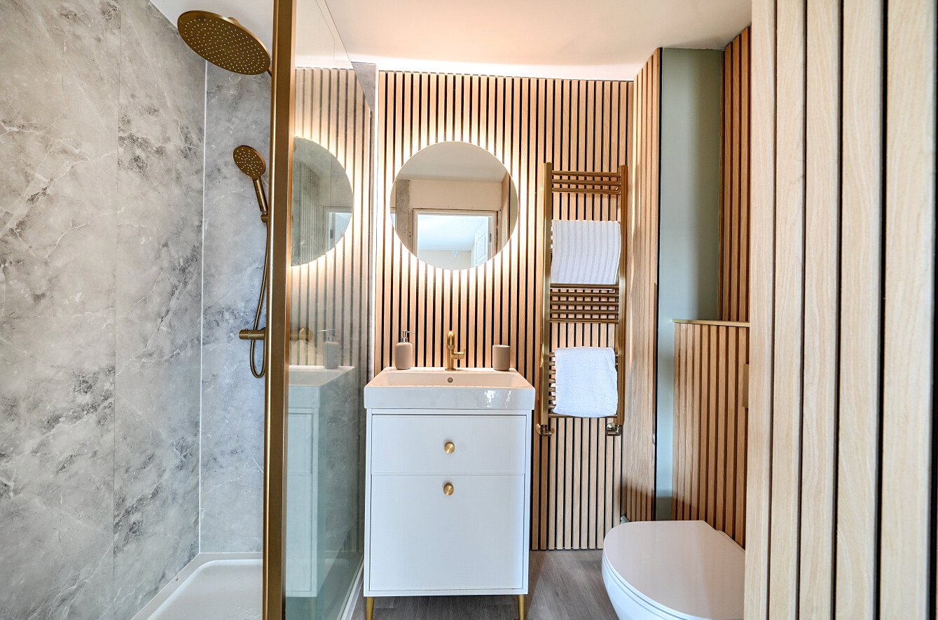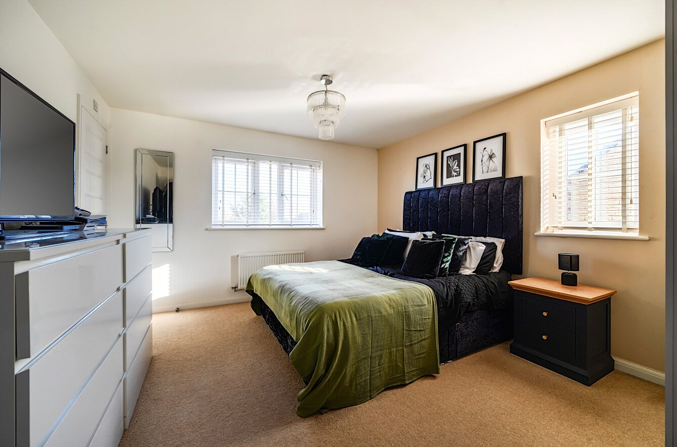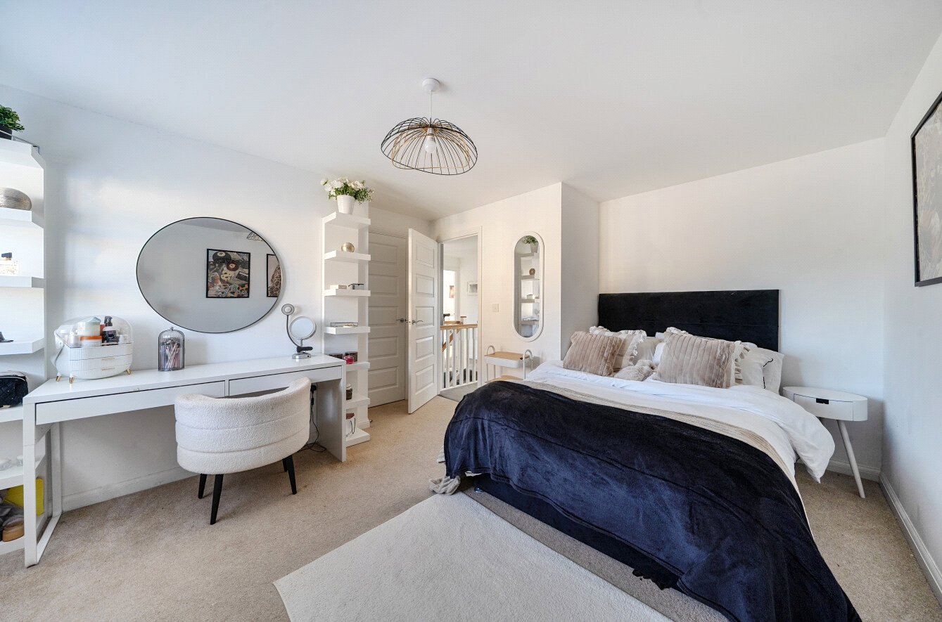 The principal bedroom is a spacious front-facing double room enjoying dual-aspect windows to the front and side. The en-suite shower room features a large walk-in shower with gold-accent rainfall showerhead and hand attachment, vanity basin with matching gold tap, LED-backlit mirror, vertical gold heated towel rail, WC and a combination of light, wood slatted wall panelling and granite-effect shower surround. Bedroom two is another generous front-facing double bedroom with a bay window and an over-stairs storage cupboard. Bedrooms three and four are both rear-facing double bedrooms, offering flexible accommodation for family or guests. The family bathroom is fitted with a wide wall-mounted vanity unit and basin, WC and a bath with ceiling-mounted rainfall shower. Granite-effect wall panelling surrounds the bath, complemented by grey wood-effect laminate flooring, a heated towel rail and a rear-facing obscured window. The landing features a loft hatch and large double airing cupboard with shelving.