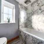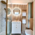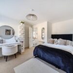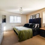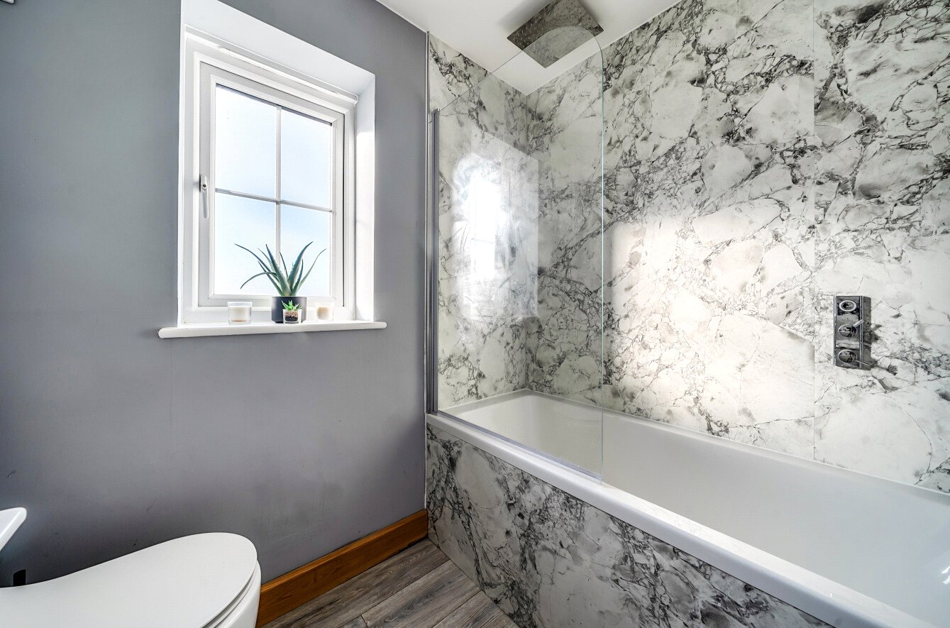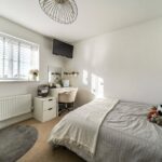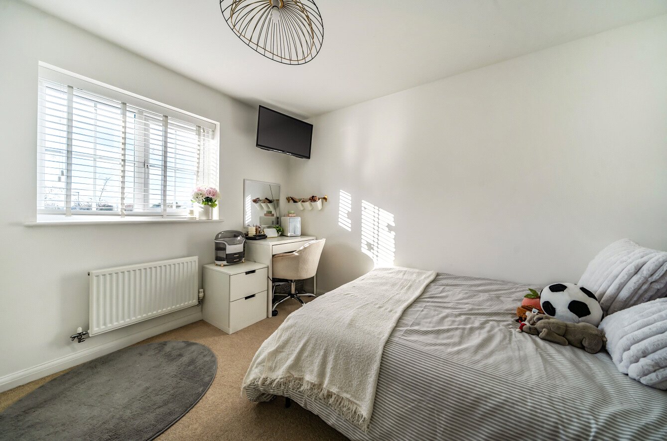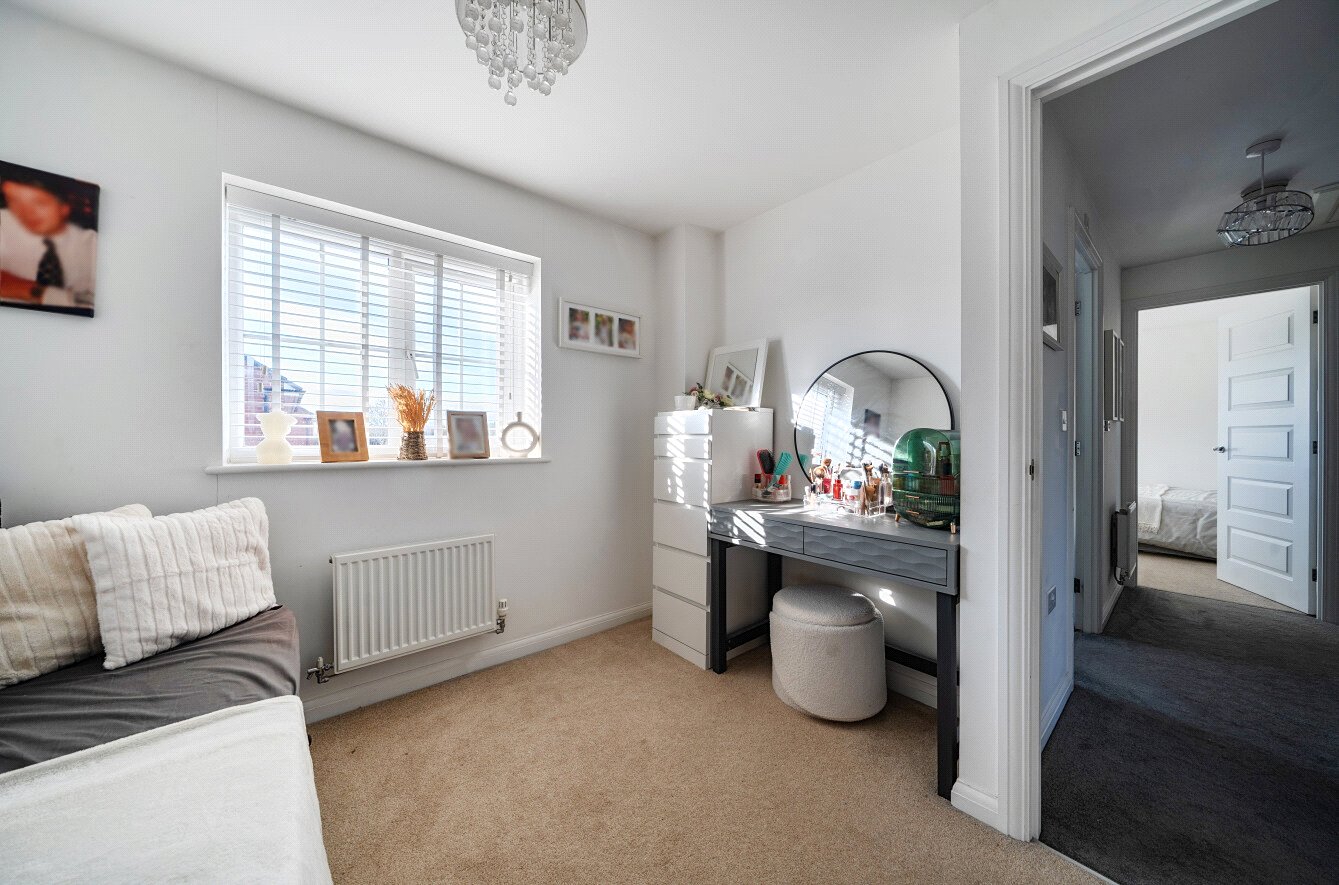 The principal bedroom is a spacious front-facing double room enjoying dual-aspect windows to the front and side. The en-suite shower room features a large walk-in shower with gold-accent rainfall showerhead and hand attachment, vanity basin with matching gold tap, LED-backlit mirror, vertical gold heated towel rail, WC and a combination of light, wood slatted wall panelling and granite-effect shower surround. Bedroom two is another generous front-facing double bedroom with a bay window and an over-stairs storage cupboard. Bedrooms three and four are both rear-facing double bedrooms, offering flexible accommodation for family or guests. The family bathroom is fitted with a wide wall-mounted vanity unit and basin, WC and a bath with ceiling-mounted rainfall shower. Granite-effect wall panelling surrounds the bath, complemented by grey wood-effect laminate flooring, a heated towel rail and a rear-facing obscured window. The landing features a loft hatch and large double airing cupboard with shelving.