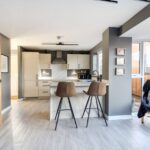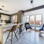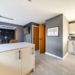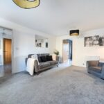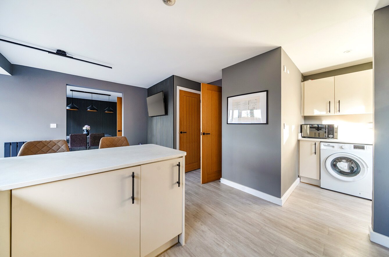 The kitchen/breakfast room is fitted with off-white gloss cabinetry, white granite effect worktops and black accent handles. Integrated appliances include a fridge/freezer, dishwasher, oven and four-ring induction hob with extractor above. Under-cabinet lighting enhances the space, while the sink sits beneath a rear-facing window with an integrated drainer and instant hot water tap. The U-shaped kitchen incorporates a breakfast bar, and an additional seating area is positioned beside double patio doors flanked by full-height windows, allowing natural light to flood the space. A separate utility area offers additional worktop space, room for appliances and a side door opening onto the driveway.