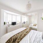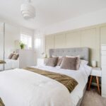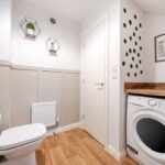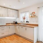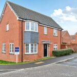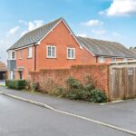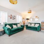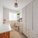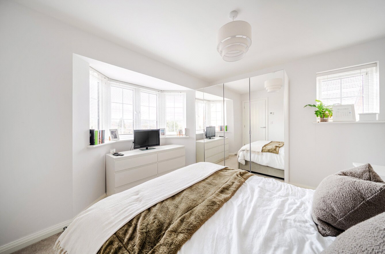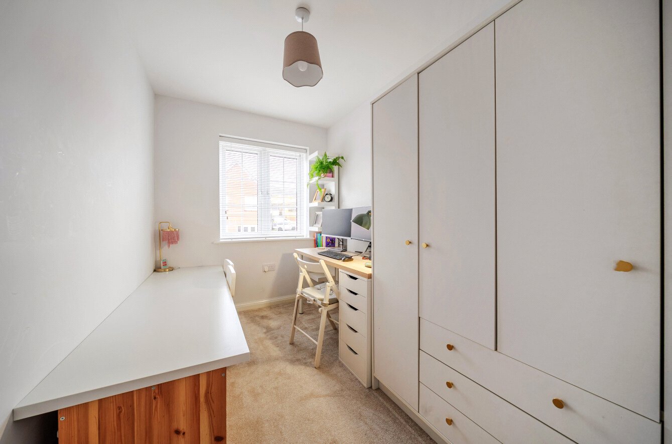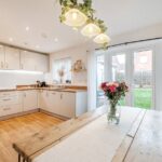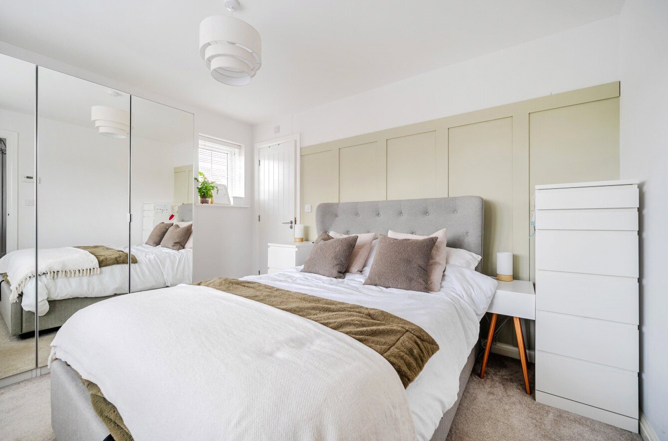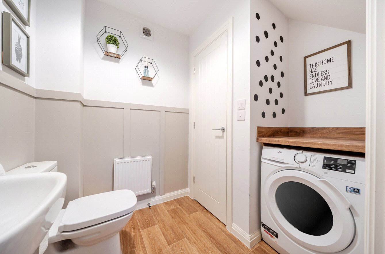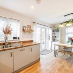 The front door opens into a welcoming entrance hall finished with wood-effect vinyl flooring, panelled walls and discreet push-to-open understairs storage. A cloakroom sits just off the hall, incorporating a WC, basin, airing cupboard and space for a washing machine with worktop above. The kitchen/dining room enjoys both front and side aspects, with a front-facing window and glazed French doors opening onto the patio. Fitted with sleek grey gloss cabinetry and wood-effect worktops, the kitchen includes an integrated fridge/freezer, dishwasher, Zanussi double oven, induction hob with extractor above and a stainless steel 1 ½ bowl sink with drainer. There is ample space for a dining table beneath feature pendant lighting, creating a sociable hub for everyday living. The living room sits at the other side of the property, filled with natural light from a bay window with a built-in window seat and storage beneath, complemented by two additional side windows and soft carpeting for a comfortable atmosphere.