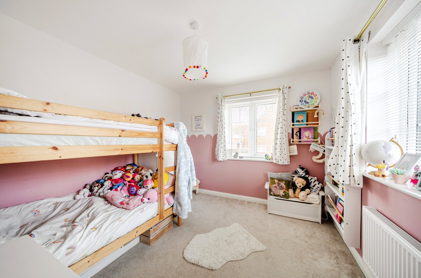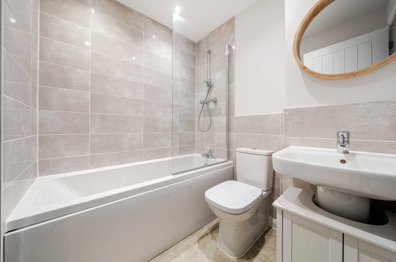 Upstairs, a galleried landing with a front-facing window provides access to the loft, which is boarded for storage. The principal bedroom is a well-proportioned double room featuring a bay window to the front, a high-level side window and decorative wall panelling, with the added benefit of an en-suite shower room comprising a shower with hand attachment, WC, basin and heated towel rail. Bedroom two is another generous double room enjoying dual aspect windows, while bedroom three offers a flexible single bedroom. The family bathroom is finished in grey tiling and includes a bath with shower over, basin, WC and heated towel rail.