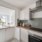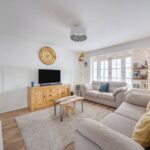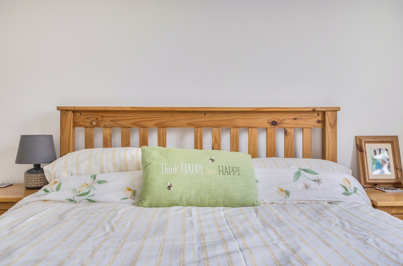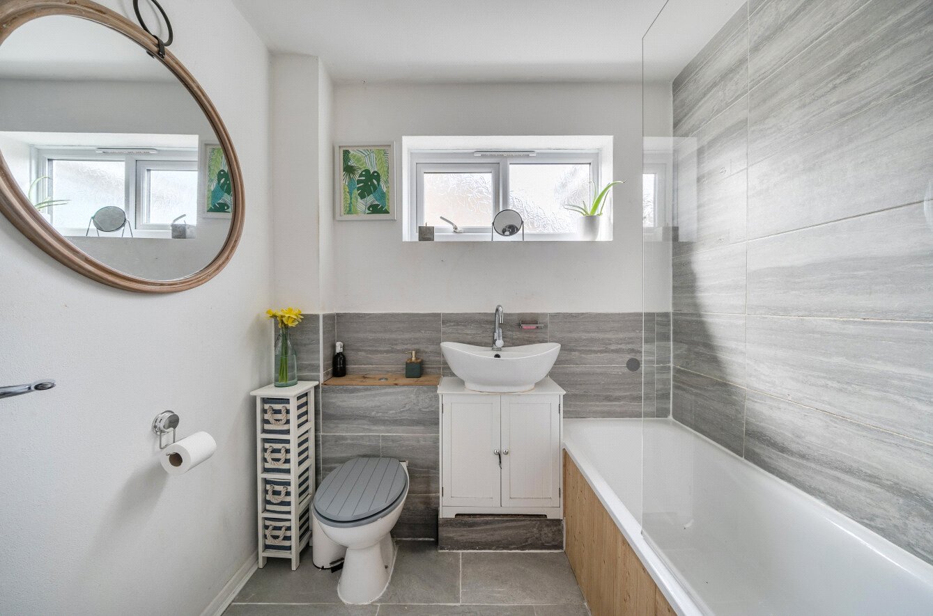 The property offers two well-proportioned double bedrooms, both positioned to the front of the home. The principal bedroom benefits from a generous walk-in wardrobe with double doors providing excellent storage. Bedroom two is also a good-sized double bedroom. The family bathroom is finished with large stone floor and wall tiles and comprises a bath with rainfall shower and handheld attachment over, WC, basin and heated towel rail. A high-level obscured window provides natural light while maintaining privacy.