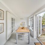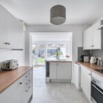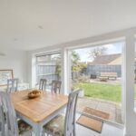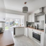 The property is accessed via a side porch leading into a welcoming hallway with useful cupboard storage and access to the loft. The heart of the home is the well-appointed kitchen and dining room, creating a spacious and light-filled area ideal for modern living. The kitchen is fitted with contemporary grey cabinetry complemented by wood-effect worktops, stone floor tiling and includes a built-in oven with four-ring electric hob and extractor above, alongside a stainless-steel sink with drainer and space for an American-style fridge/freezer and slimline dishwasher. From the kitchen, a utility area provides space for a washing machine, further cabinetry and a useful breakfast bar. Beyond this, the dining room provides a bright and airy space for dining and entertaining, with large rear windows and French doors opening out to the garden allowing natural light to fill the space. From here, double doors connect through to the sitting room, creating a sociable and flexible flow between the living spaces.