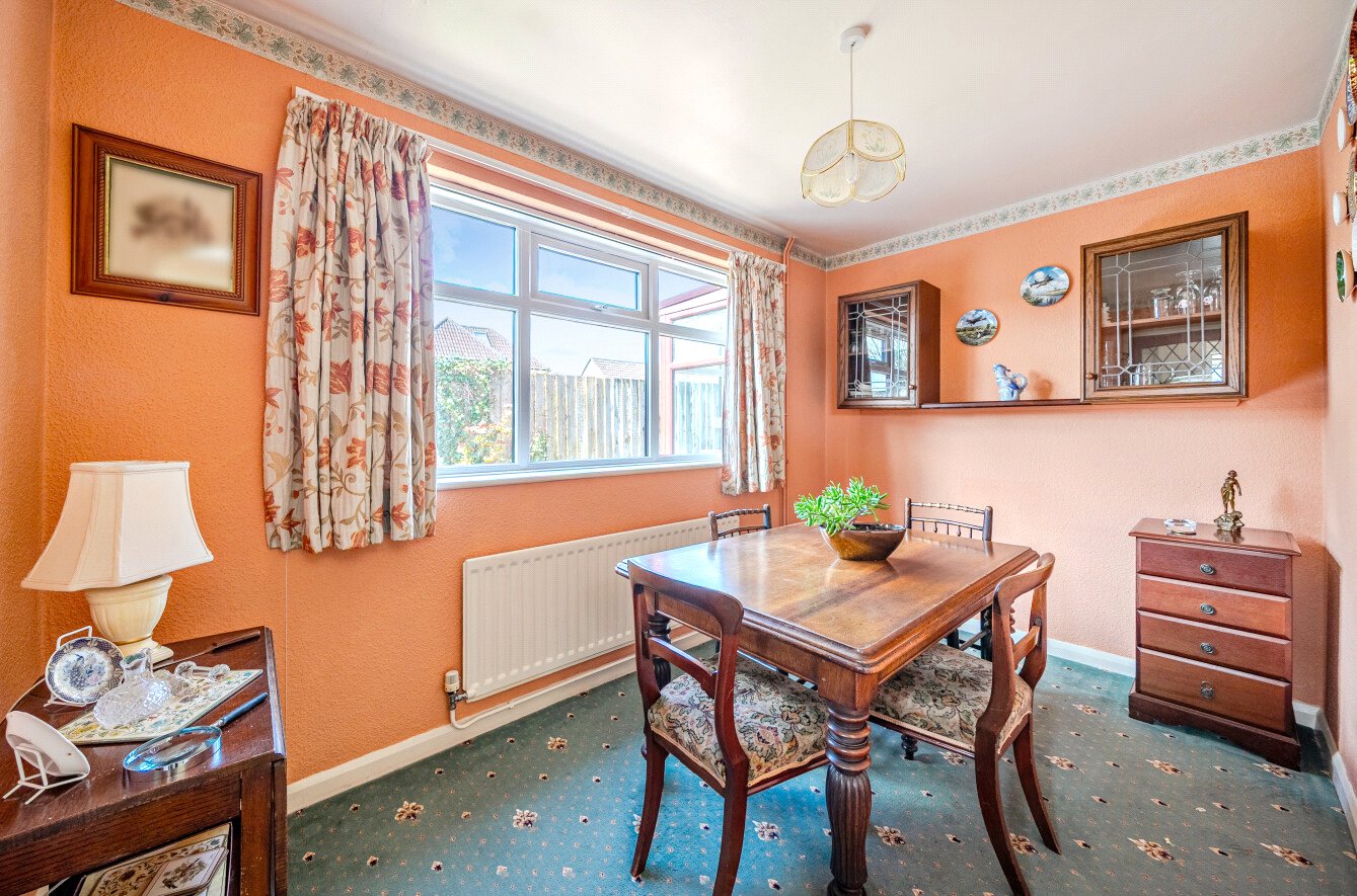 The property is entered via an enclosed porch with an obscured window, creating a practical entrance before opening into the dining room. The dining room offers a versatile reception space, with a side-facing window and an archway leading through to the kitchen.