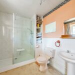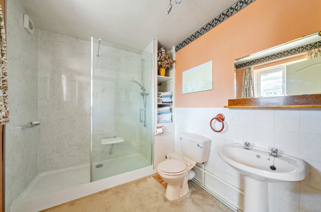 The shower room has been fitted with a walk-in shower with marble-effect wall panelling, WC and basin, and offers scope for updating to suit individual tastes.