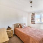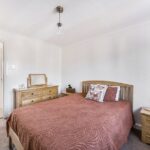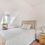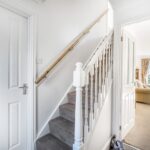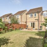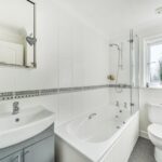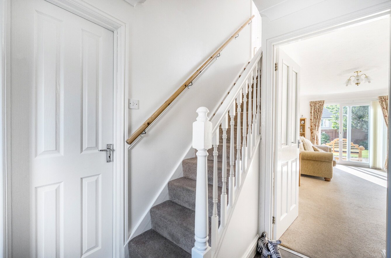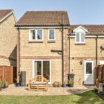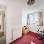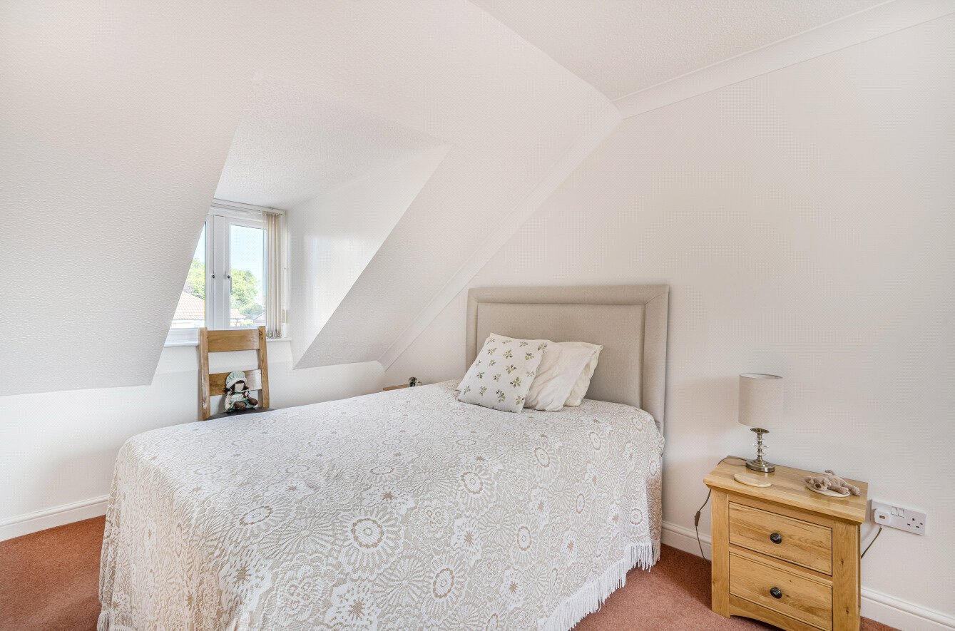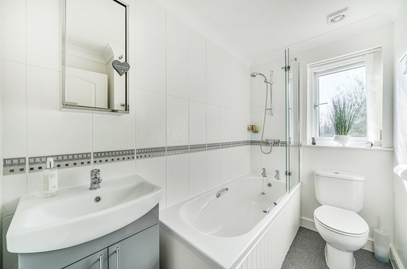 The principal bedroom, set above the garage, features charming, sloped ceilings and dual-aspect dormer windows, making it a light and airy double room. Bedroom two is another comfortable double, facing the front of the house, and includes a built-in double wardrobe. Bedroom three is a single room at the rear of the property with a built-in single wardrobe and enjoys garden views- ideal for a home office or child’s bedroom. The family bathroom is fitted with a sleek gloss-grey vanity unit and basin, W/C and a bath with Mira Fino shower above. Finished with modern white and grey tones, the room also includes an obscure window for privacy. The landing provides access to a shelved airing cupboard and a loft hatch.