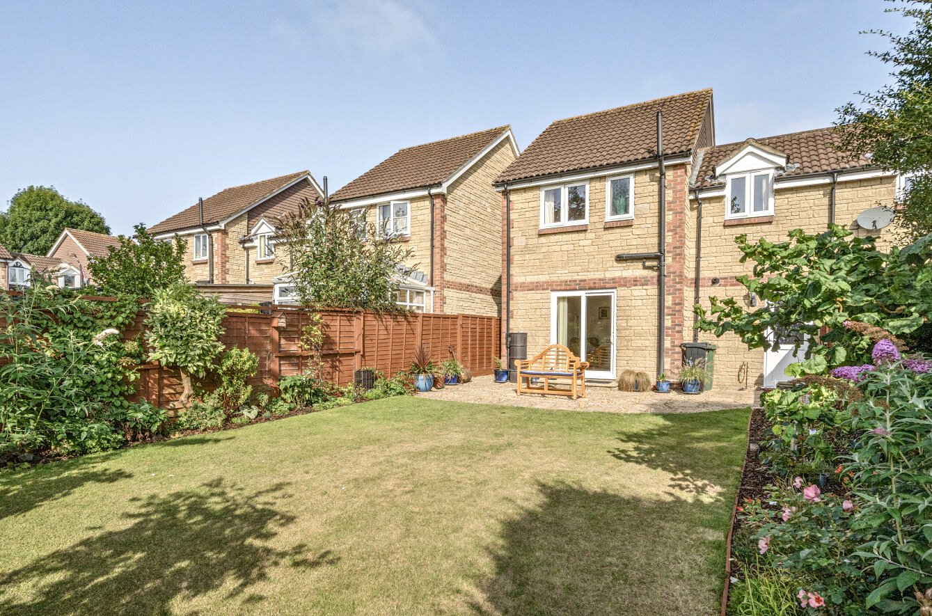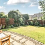 The rear garden is a lovely private space and features a paved area laid in a square pattern with gravel insets – a perfect area for outdoor furnishings. There is a neat lawn bordered with planting beds and a small nature pond. The garden includes outdoor electrics, a tap, outdoor light and side gate providing access to the front of the house. At the front, a charming storm porch shelters the front door, while the navy-blue garage door adds a vibrant touch to the property's exterior. The block-paved driveway offers convenient parking in front of the garage and leads to the property’s entrance. This is complemented by a well-kept front lawn, enhancing the home’s curb appeal.