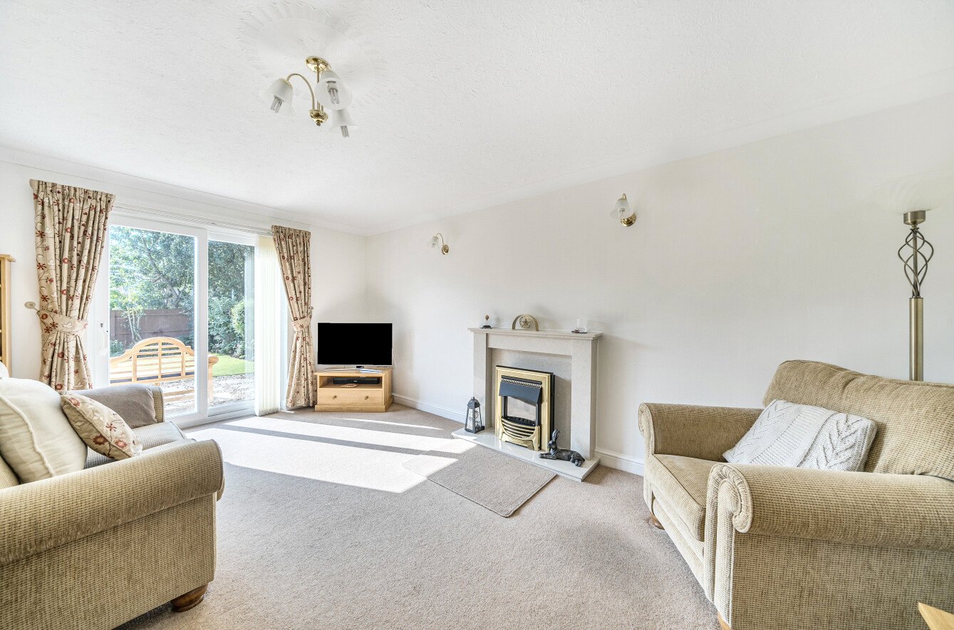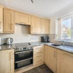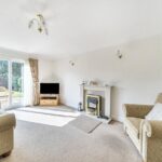 The kitchen is positioned at the front of the house and is fitted with wood-effect wall and base cabinets, a built-in fridge/freezer, dishwasher and double oven with four-ring hob and extractor above. A stone-textured tiled backsplash and stainless-steel sink with angled tap and drainer complete the look, with a front-facing window allowing plenty of natural light. The sitting room is a bright and spacious area at the rear of the property, with sliding glass doors opening directly out to the garden. A granite effect fireplace with gas fire forms the focal point of the space, flanked by two wall lights. A discreet understairs cupboard provides handy storage. The attached garage can be accessed via the hallway and includes plumbing for appliances, up-and-over electric garage door, lighting and houses the combi-boiler.