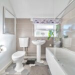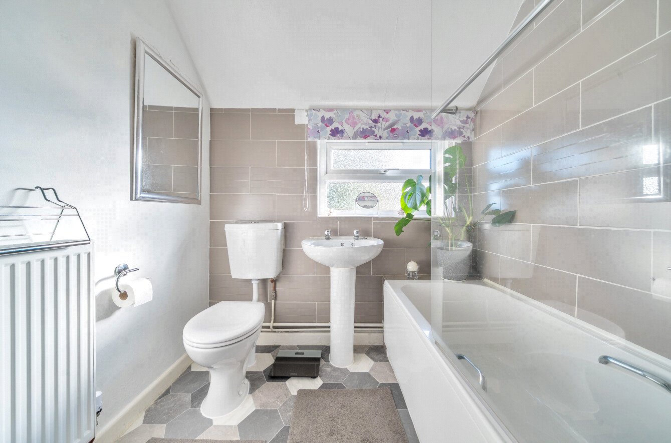 Entering through the half-glazed front door into the L-shaped hallway, a utility area sits to the left. This is a practical space with plumbing for a washing machine beneath a useful worktop with shelving above, storage for household essentials and space for shoes and coats. This area has both electricity and lighting, making it a handy addition to the home. The bathroom features a bath with electric Mira Vie shower over and shower screen, WC and washbasin. A slim obscured window brings in natural light and the space is finished with taupe tiles with textured detailing and white and grey marble effect hexagonal vinyl flooring. Opposite, the double bedroom overlooks the rear garden and benefits from a large built-in wardrobe with sliding doors, providing excellent storage.