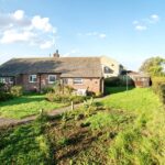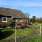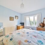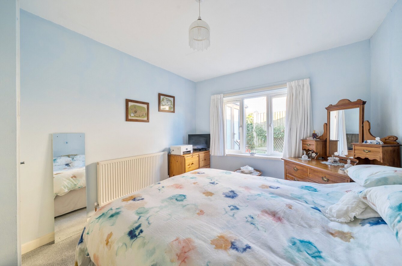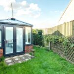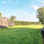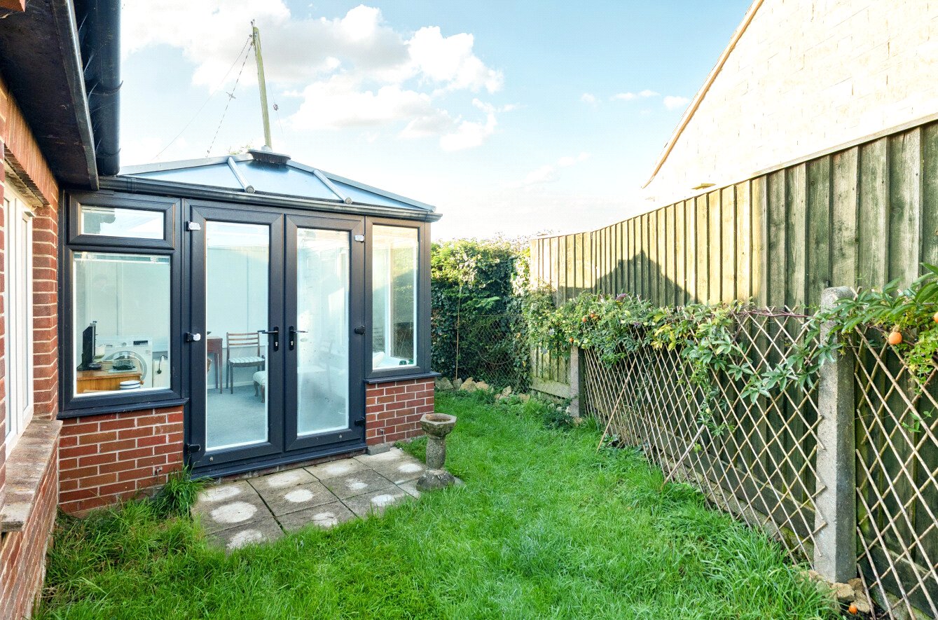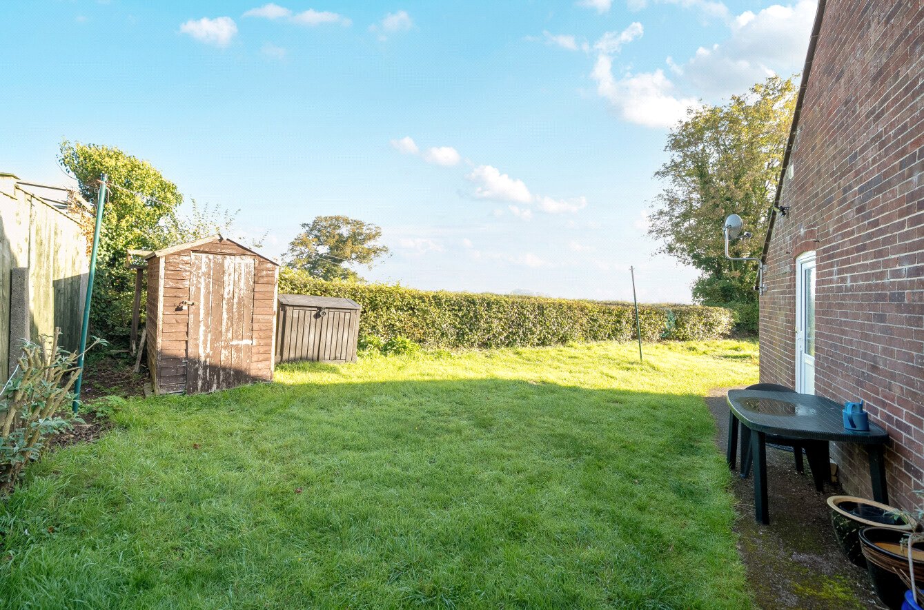 The garden wraps around the property and is laid to lawn with a pathway leading to the front door with planted beds – one with established shrubs and another with roses. A wooden shed, washing line, and hedge with open fields beyond create a private and practical outdoor space. The rear garden has a patio to the front of the French doors and a climbing passion flower runs across the top of the fence, adding colour and charm. A meandering pathway leads down to Roselyn Crescent, where parking can be found on the roadside.