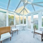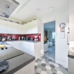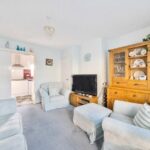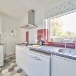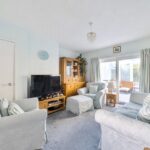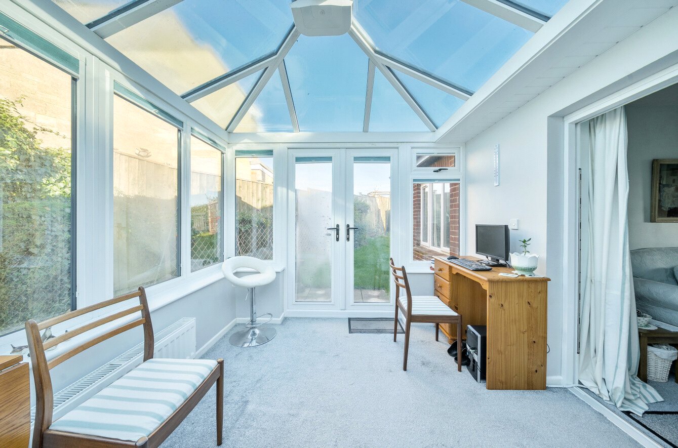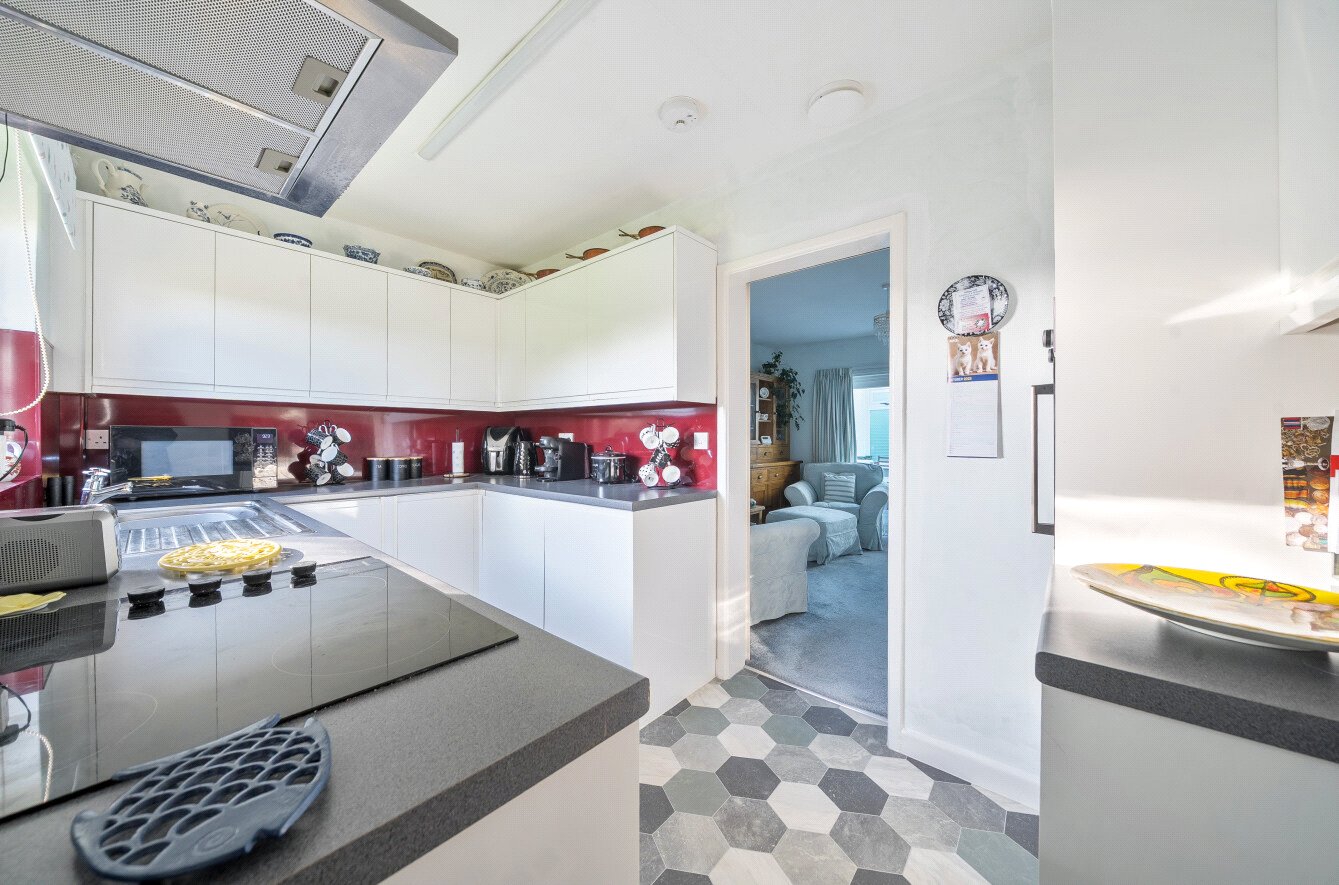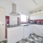 The sitting room is a bright and relaxing living area featuring a modern wall-mounted electric fire, a cupboard with shelving warmed by the neighbouring boiler, and sliding doors leading to both the kitchen and conservatory. The kitchen is spacious and stylish, fitted with white gloss wall and base units complemented by grey granite effect worktops and a red acrylic splashback. Appliances include an integrated fridge and freezer, eye-level single oven, 4-ring electric hob with stainless steel chimney extractor, and space for a dishwasher beneath the counter. A font-facing window brings in plenty of light, and the matching hexagonal-patterned grey and white vinyl flooring continues the modern finish. The conservatory is a lovely additional living area with heating, lighting and electrics. Carpeted, it features concertina blinds and French doors opening to the patio and rear garden – perfect in all weathers.