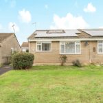 The bungalow sits behind a large front lawn with a pathway leading to the side entrance and continuing to a wooden gate providing access to the rear. The south-facing frontage benefits from solar panels, helping to improve energy efficiency.
