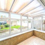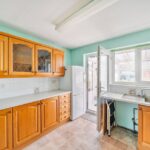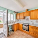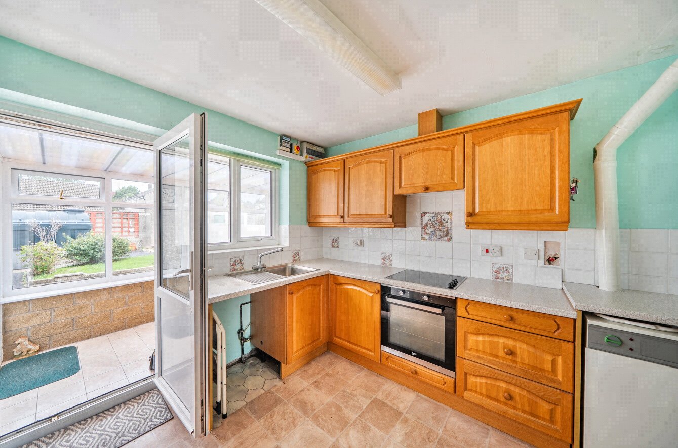 Inside, the entrance hall is fitted with an airing cupboard and provides access into the partially boarded loft with lighting via a pull-down ladder. The living/dining room offers a generous, light-filled space with ample scope to create both seating and dining areas, making it the heart of the home. To the rear, the kitchen provides a full range of fitted wooden cabinetry, a built-in oven with hob and extractor, stainless steel sink with drainer and window above, space for a fridge/freezer and plumbing for appliances. From here, a door opens into the rear porch – a useful area with tiled flooring, lighting and power, providing space for extra appliances if desired. Glazed windows frame the garden views, while a back door gives direct access outside.